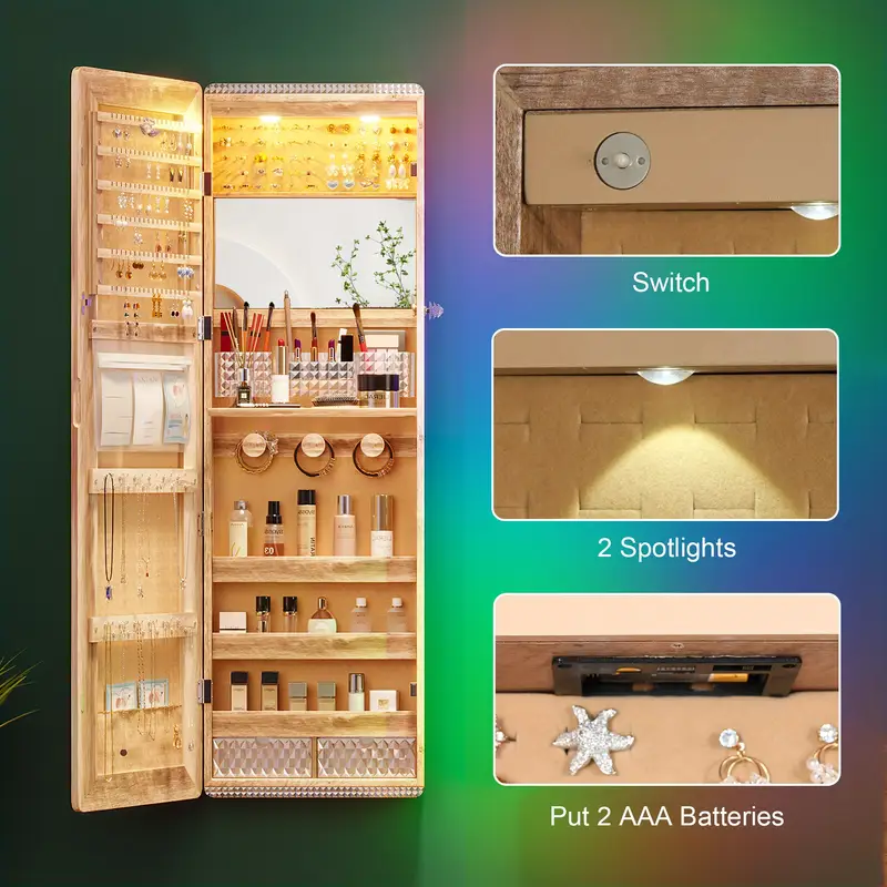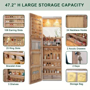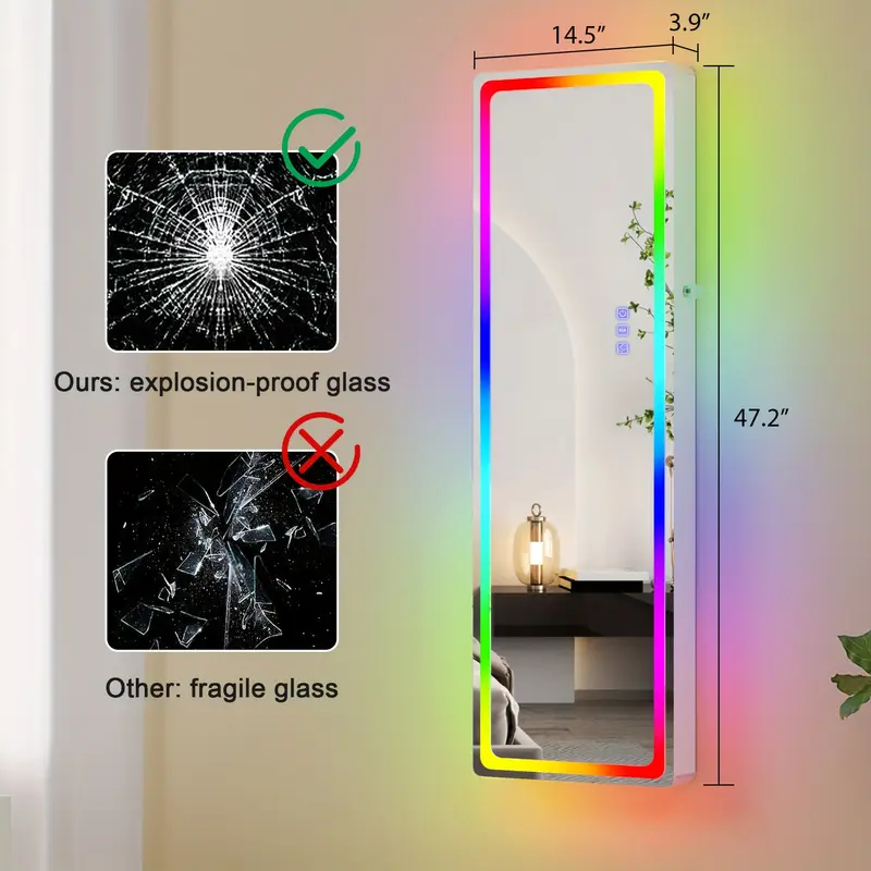HNEBC LED Mirror Jewelry Cabinet with RGB Lights, 47.2″ Wall-Mounted Wooden Armoire Organizer, Full-Length Mirror, 2 Drawers, Lockable Storage for Bedroom & Bathroom, Contemporary Design, White Hardwood Finish