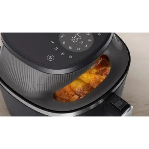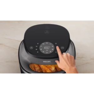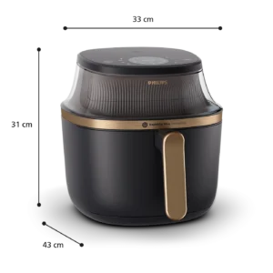 **เปอร์เซ็นต์เฉลี่ยตามการวัดในห้องปฏิบัติการภายในของ Philips Airfryer จากการปรุงสุกอกไก่หนึ่งชิ้น (ตั้งค่า AF ที่ 160 °C โดยไม่อุ่นเครื่องก่อน) หรือแซลมอนแล่ (ตั้งค่า AF ที่ 200 °C โดยไม่อุ่นเครื่องก่อน) เทียบกับการใช้เตาอบเกรดเอ